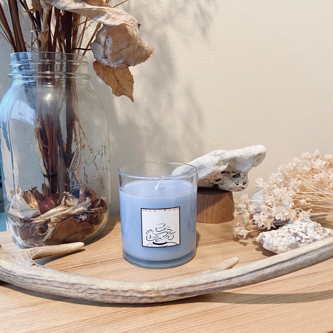 小さな窓の様なイラストがアクセントの水色のアロマキャンドルです。コットンの優しい香りでリラックスタイムのお楽しみに。