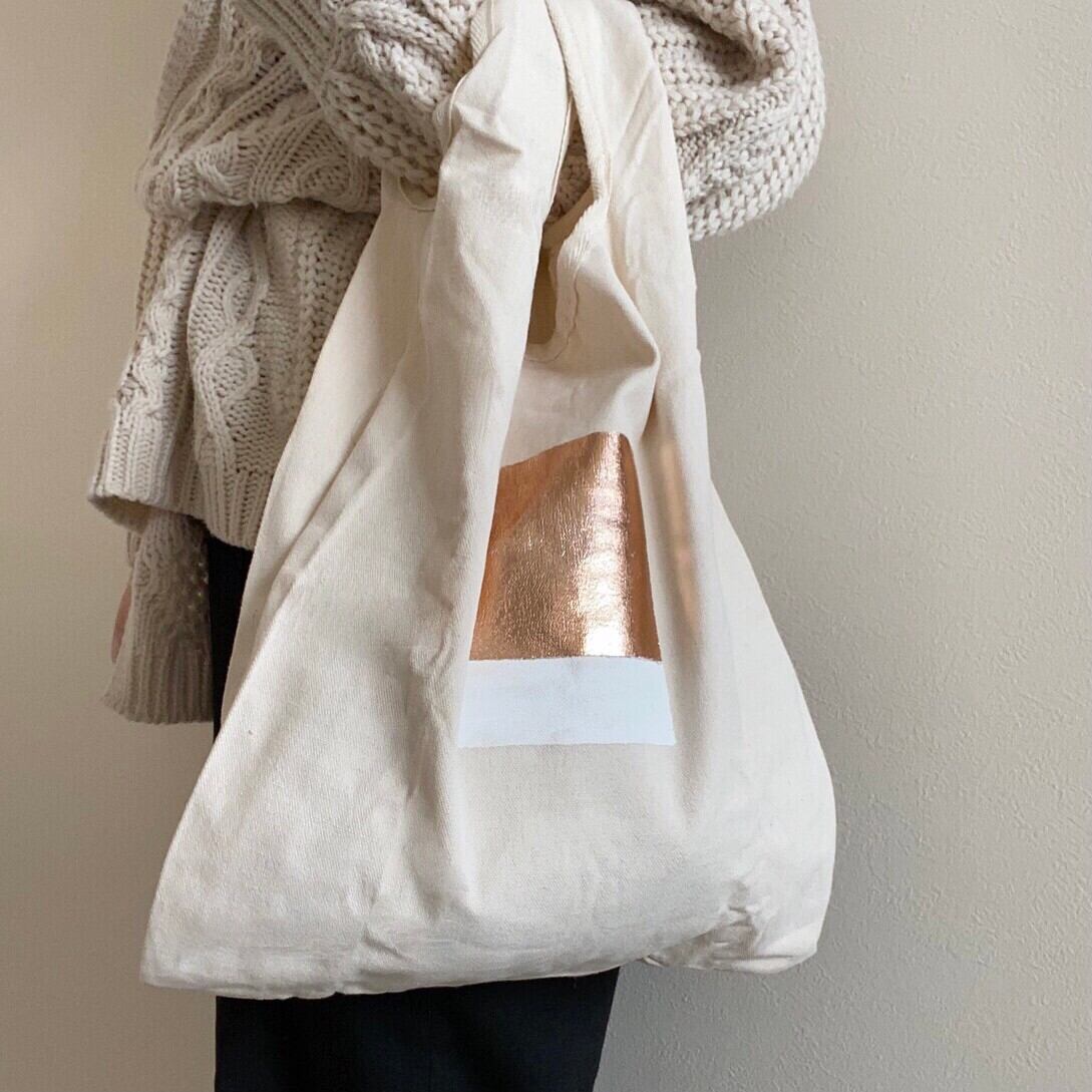 ペイントとコッパーの箔を施した小さく折り畳めるトートバッグです。ちょっとしたお買い物に。