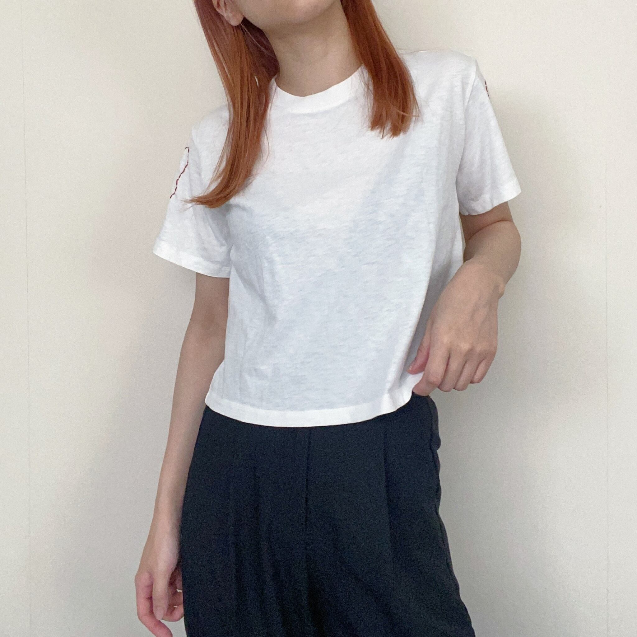 短めの丈なので、ハイウエストのズボンを合わせてもよし!おへそをチラ見せするのもよし!なキュートなTシャツです