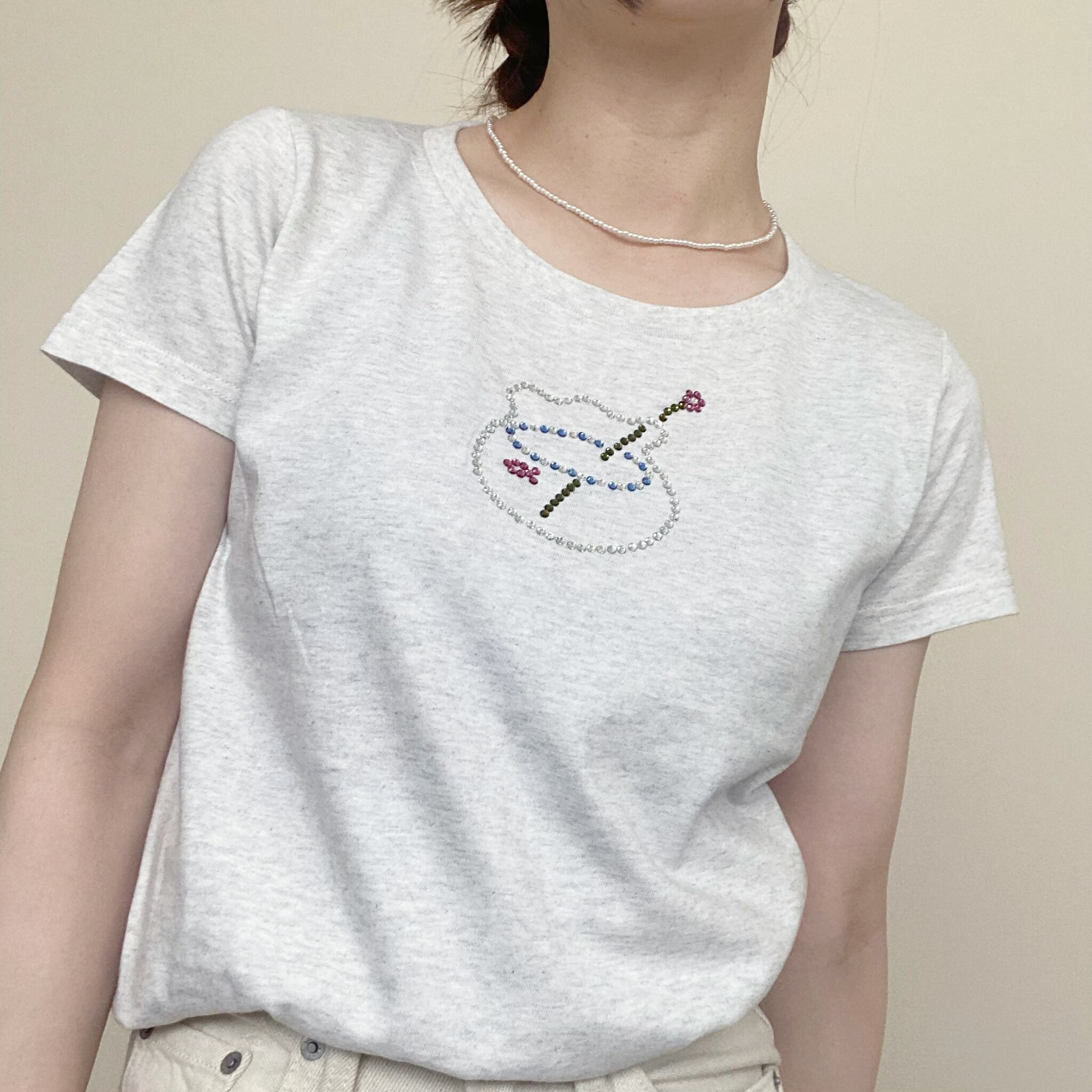 寄り添い合う金魚とお花がビーズストーンで表現された、キラキラかわいいTシャツ!