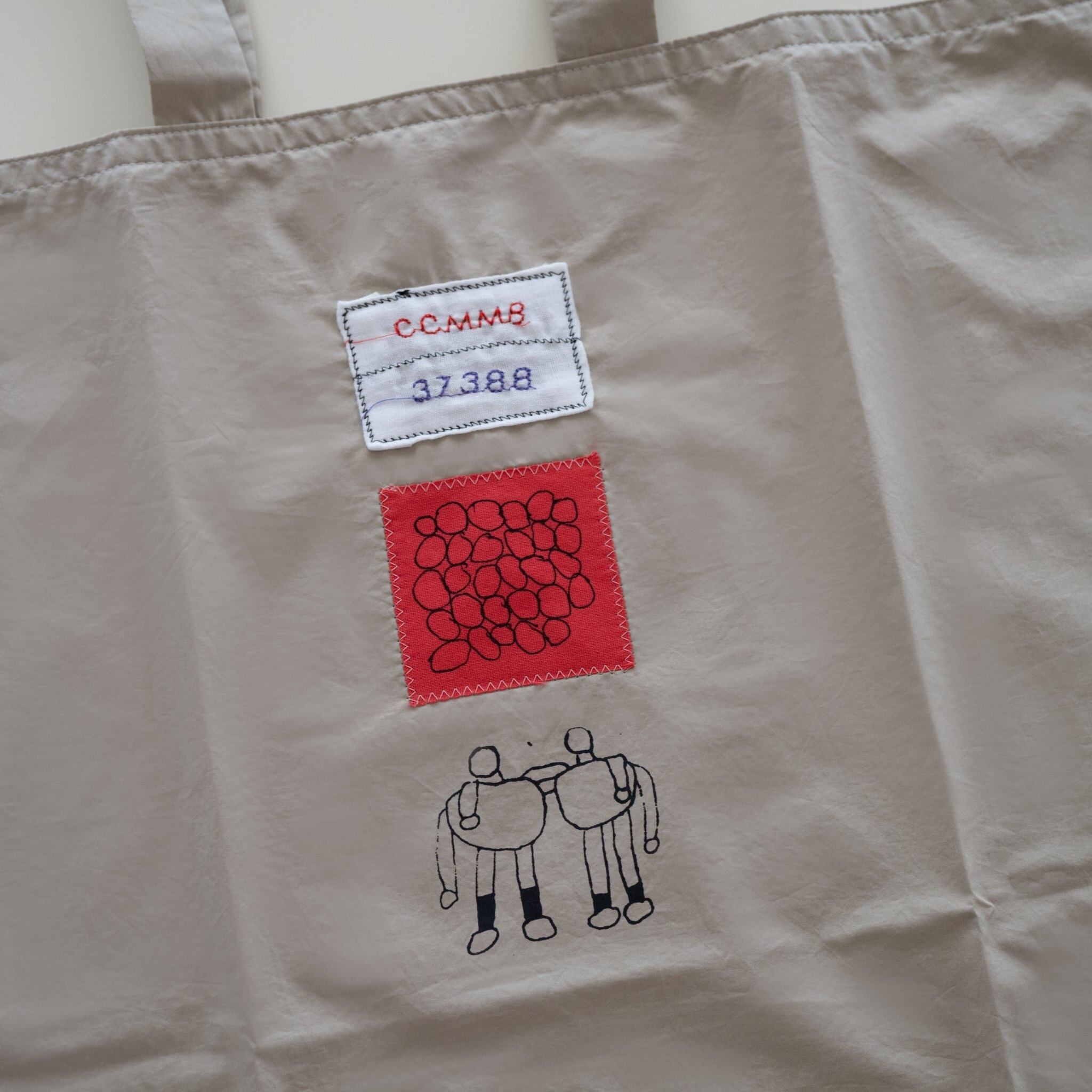 刺繍のタグやシルクスクリーンプリントなどが施されており、たくさんの丸はひとつずつ手書きで制作されています。